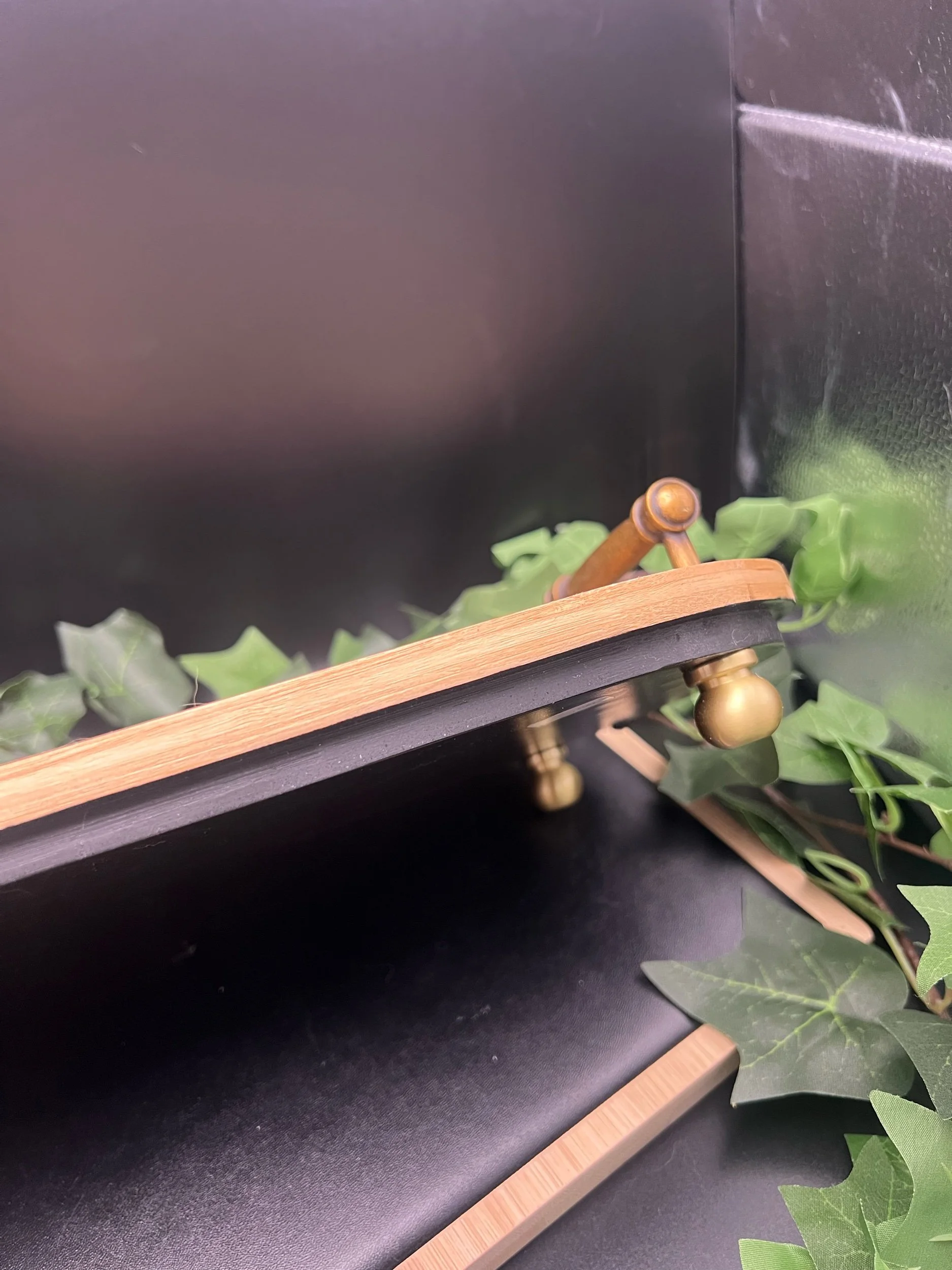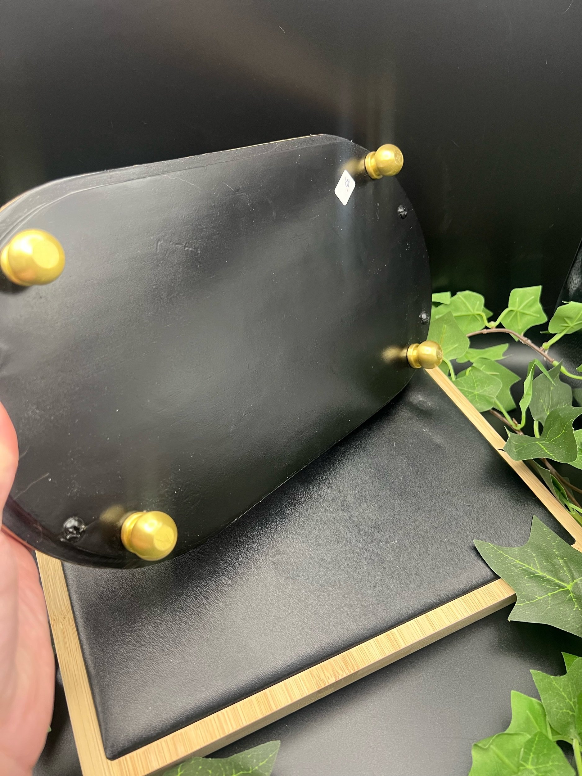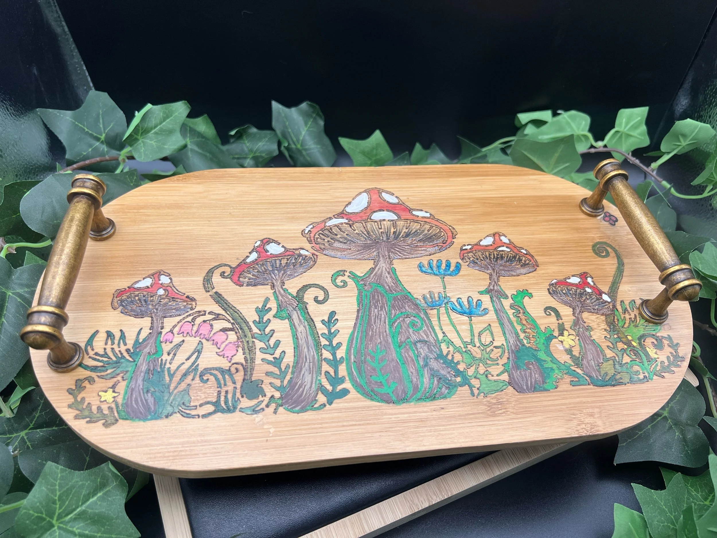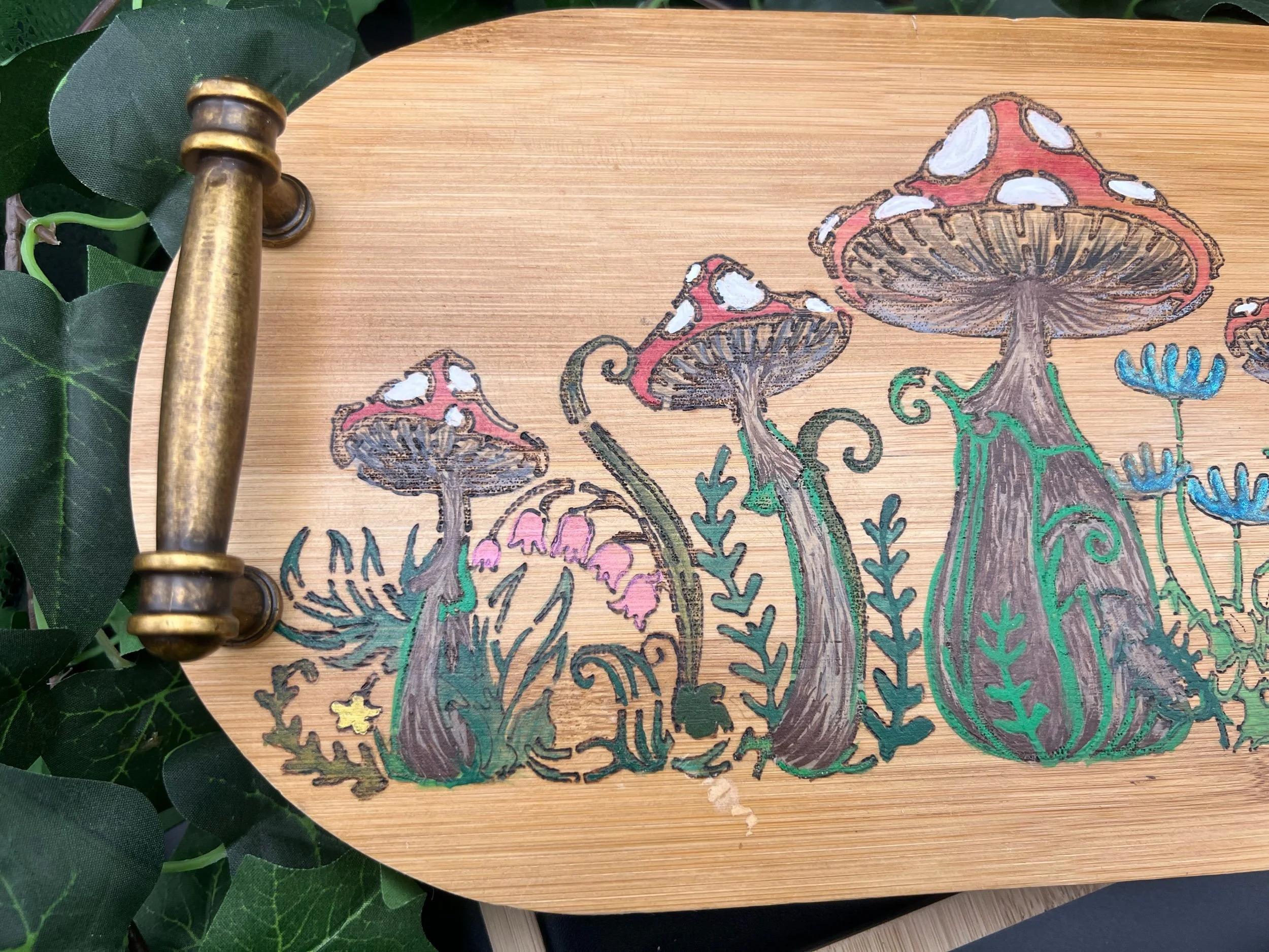 So this is all wood- solid wood with brass knob feet and brass handles. The top is wood burned mushrooms design, and then hand painted with watercolors. Sealed with Polyurethane. Hand wash only.